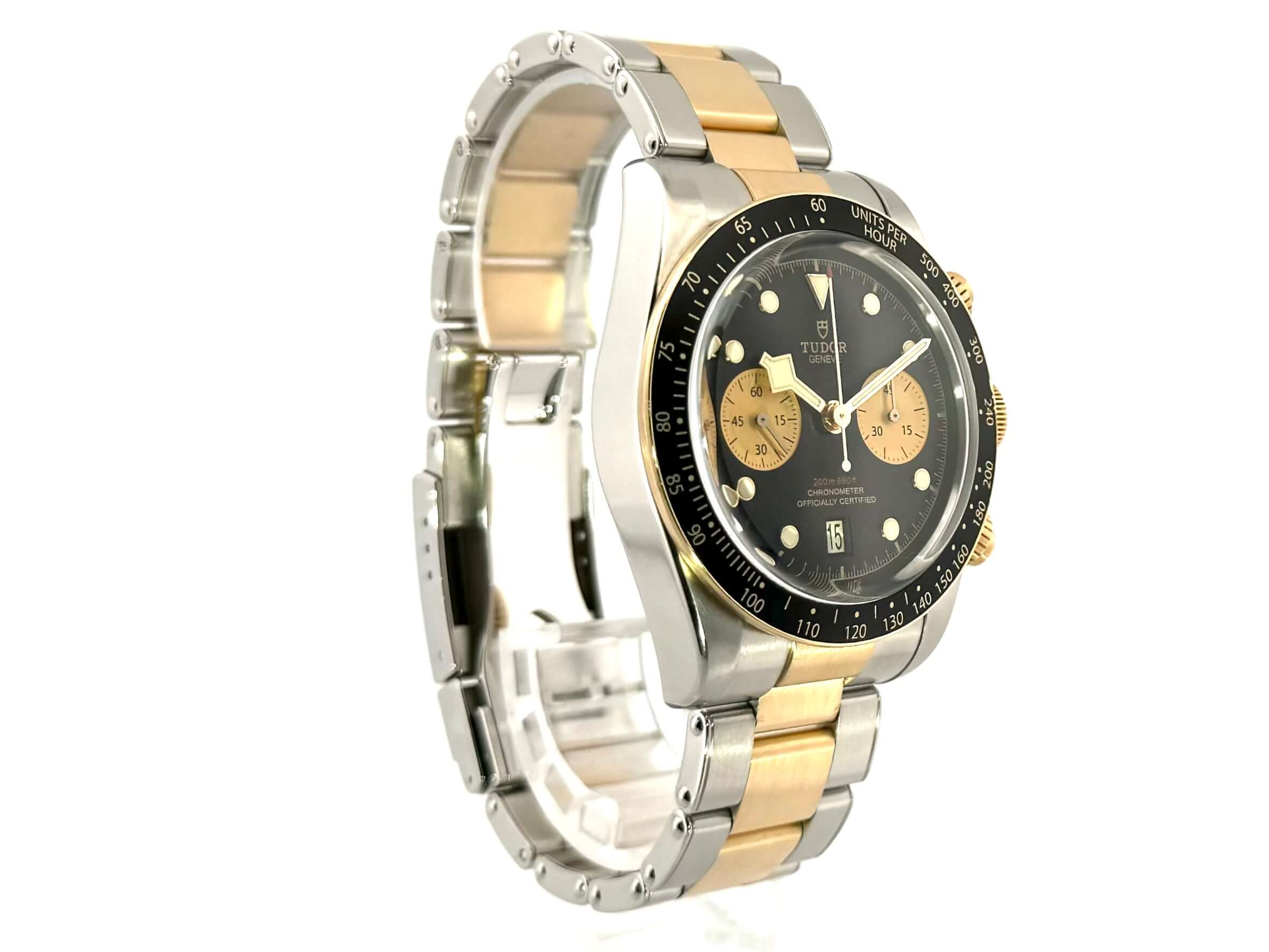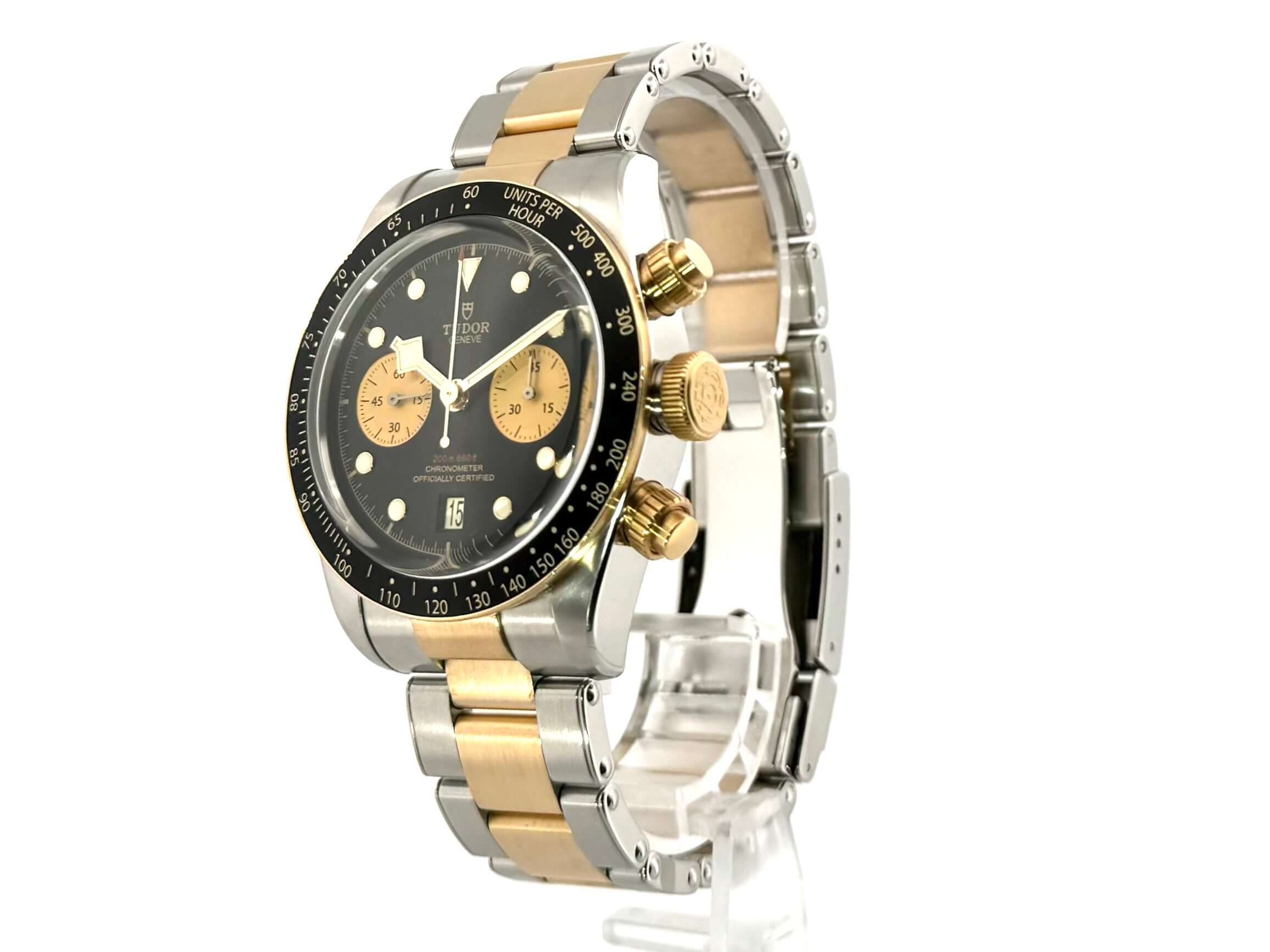 Gehäuse aus Edelstahl / Gelbgold poliert und satiniert, Gehäusedurchmesser 41 mm, Gelbgold Lünette mit schwarzer Einlage, 60 Minuten Skala und Leuchtpunkt, einseitig drehbar, Edelstahl / Gelbgoldband mit Sicherheitsfaltschließe, schwarzes Zifferblatt mit aufgesetzten Leuchtindizes, Leuchtzeiger, Uhrwerk Automatik, Manufakturkaliber Tudor MT5813, 70 Stunden Gangreserve, Datum, Chronograph, kleine Sekunde, Chronometer, Saphirglas, verschraubte Krone, Edelstahlboden verschraubt und graviert, Wasserdicht bis zu 20 bar.