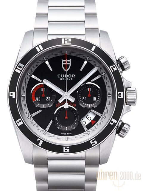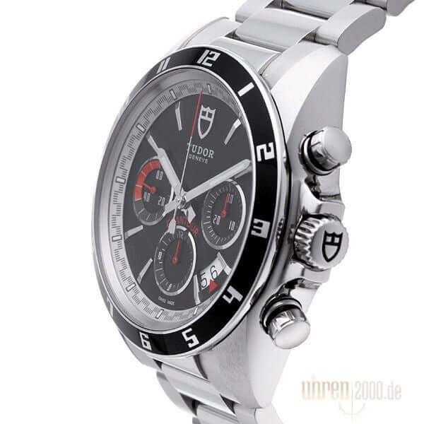 Gehäuse aus Edelstahl poliert und satiniert, Gehäusedurchmesser 42 mm, Edelstahl Lünette mit schwarzer Einlage und 12 Stunden Skala, Edelstahl Armband mit Sicherheitsfaltschließe, Zifferblatt schwarz mit aufgesetzten Leuchtindexen, Uhrwerk Automatik, Chronograph, Kaliber Tudor 7753, Datum, Saphirglas, Edelstahlboden verschraubt, Wasserdicht bis zu 15 bar.