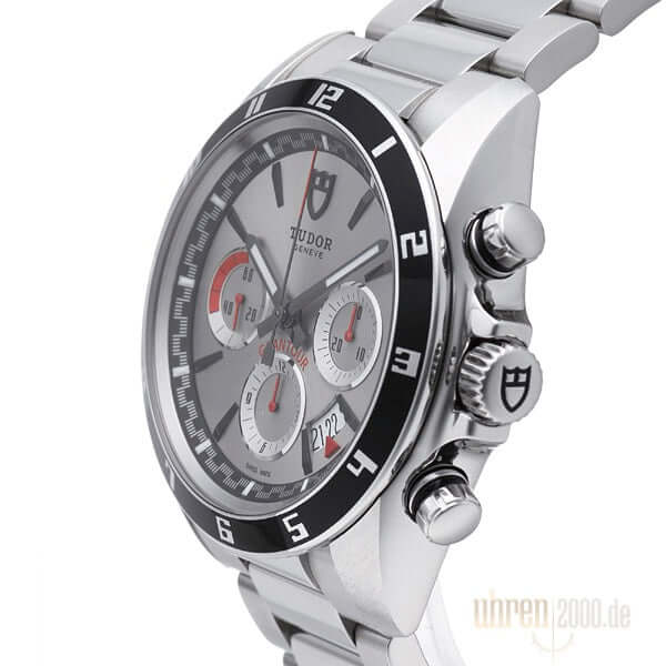 Gehäuse aus Edelstahl poliert und satiniert, Gehäusedurchmesser 42 mm, Edelstahl Lünette mit schwarzer Einlage und 12 Stunden Skala, Edelstahl Armband mit Sicherheitsfaltschließe, silberfarbenes Zifferblatt mit aufgesetzten Leuchtindexen, Uhrwerk Automatik, Chronograph, Kaliber Tudor 7753, Datum, Saphirglas, Edelstahlboden verschraubt, Wasserdicht bis zu 15 bar.