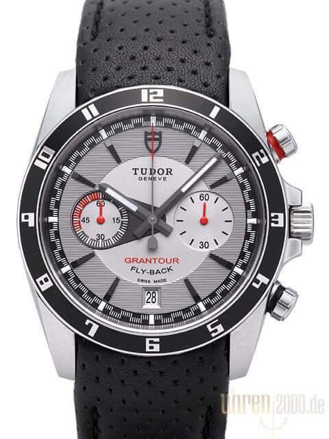 Tudor Grantour Chronograph Fly-Back Ref. 20550N perforiertes schwarzes Lederband Zifferblatt Silberfarben