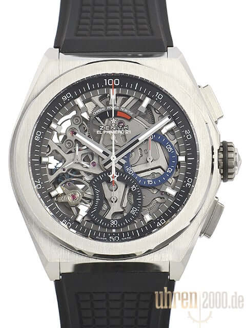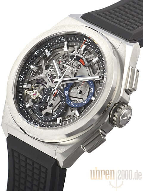 Gehäuse aus Titan satiniert, Gehäusedurchmesser 44 mm, Gehäusehöhe 14,5 mm, Titan Lünette, schwarzes Kautschukband mit Faltschließe, transparentes Zifferblatt, Automatik Uhrwerk, Kaliber El Primero 9004, 36.000 A/h, Chronograph, Gangreserve ca. 50 Stunden, kleine Sekunde, Saphirglas, Boden mit Saphirglas, Wasserdicht bis zu 10 bar.