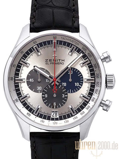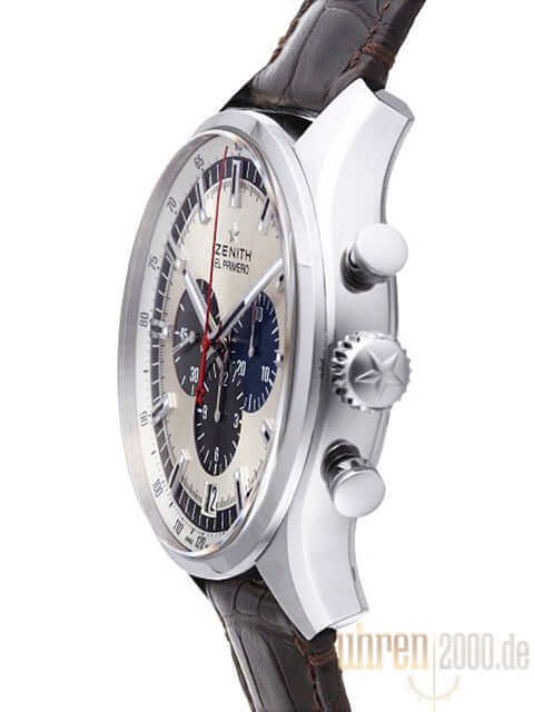Gehäuse aus Edelstahl satiniert, Gehäusedurchmesser 45 mm, Gehäusehöhe 14,05 mm, Edelstahl Lünette, braunes Lederband mit Faltschließe, silberfarbenes Zifferblatt mit Leuchtindizes, Leuchtzeiger, Automatik Uhrwerk, Zenith Kaliber El Primero 400B, 31 Steine, 36.000 A/h, Gangreserve ca. 50 Stunden, Chronograph, Datum, kleine Sekunde, Saphirglas, Edelstahlboden mit Sichtfenster, Wasserdicht bis zu 10 bar.