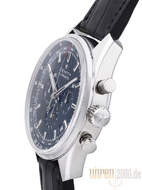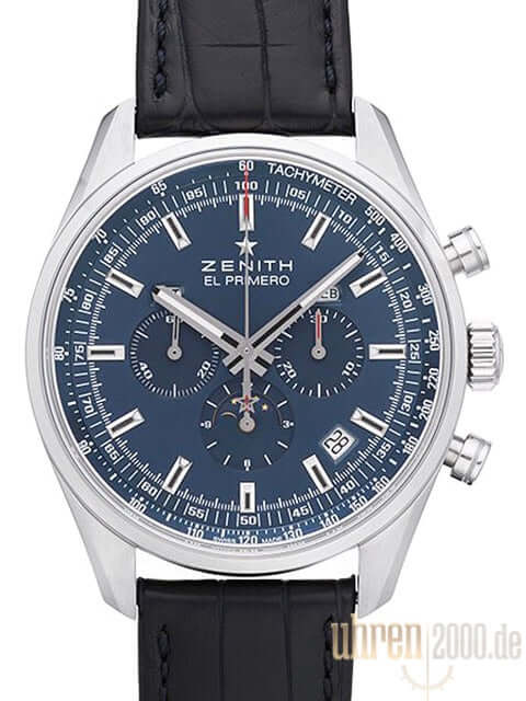 Gehäuse aus Edelstahl poliert, Gehäusedurchmesser 42 mm, Gehäusehöhe 12,75 mm, polierte Edelstahl Lünette, blaues Alligatorleder Armband mit Faltschließe, blaues Zifferblatt, Automatik Uhrwerk, Chronograph, Kaliber El Primero 410, 31 Steine, 36.000 A/h, Gangreserve ca. 50 Stunden, Datum, Monatsanzeige, Wochentagsanzeige, Mondphase, kleine Sekunde, Saphirglas, Edelstahlboden mit Saphirglas, Wasserdicht bis zu 5 bar, limitiert auf 1975 Stück.