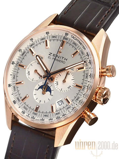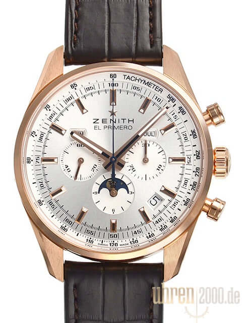 Gehäuse aus Roségold poliert, Gehäusedurchmesser 42 mm, Gehäusehöhe 12,75 mm, polierte Roségold Lünette, braunes Alligatorlederband mit Roségold Dornschließe, silberfarbenes Zifferblatt, Automatik Uhrwerk, Chronograph, Kaliber El Primero 410, 31 Steine, 36.000 A/h, Gangreserve ca. 50 Stunden, Datum, Monatsanzeige, Wochentagsanzeige, Mondphase, kleine Sekunde, Saphirglas, Roségoldboden mit Saphirglas, Wasserdicht bis zu 5 bar.