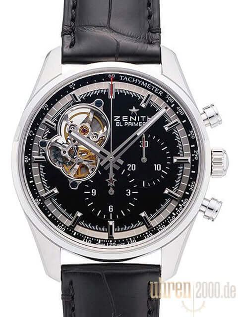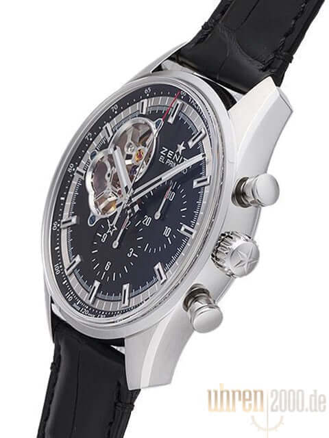 Gehäuse aus Edelstahl satiniert, Gehäusedurchmesser 42 mm, Gehäusehöhe 14,05 mm, Edelstahl Lünette, schwarzes Krokoleder mit Faltschließe, schwarzes Zifferblatt mit Leuchtindizes, Leuchtzeiger, Automatik Uhrwerk, Zenith Kaliber El Primero 4061, 31 Steine, 36.000 A/h, Gangreserve ca. 50 Stunden, Chronograph, kleine Sekunde, Saphirglas, Edelstahlboden mit Sichtfenster, Wasserdicht bis zu 10 bar.